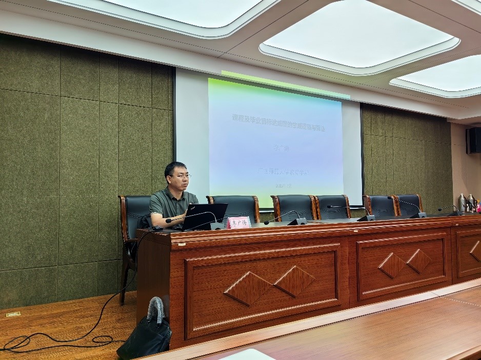 8月27日上午,广西师范大学教育学部副部长、博士生导师李广海教授应冰球官网邀请,对冰球官网教师进行课程目标达成度计算专项培训。李广海教授兼任中国教育战略发展学会教育法治专业委员会常务理事、中国成人教育协会教师教育培训专业委员会副理事长、中国学前教育研究会学前教育管理专委会委员、广西教育政策与法治研究专业委员会秘书长。培训会由杨日飞副院长主持。院长赵荣辉、副院长边琦、系部主任、各系专任教师以及来自心理学院、历史文化学院等50多名教师参加了培训学习。